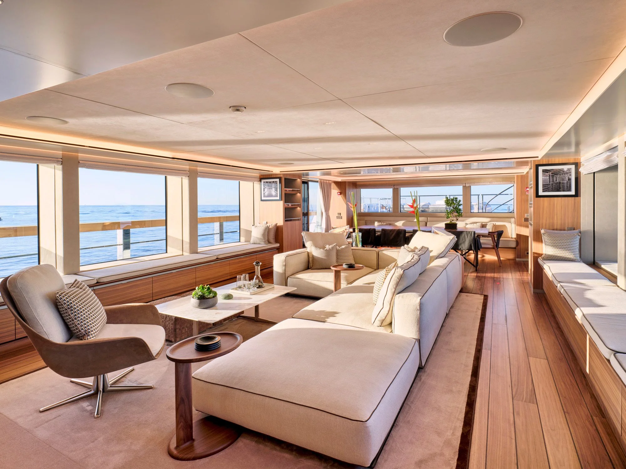 Flexible Main Salon with panoramic windows, a convertible dining area, and designer lounge seating.