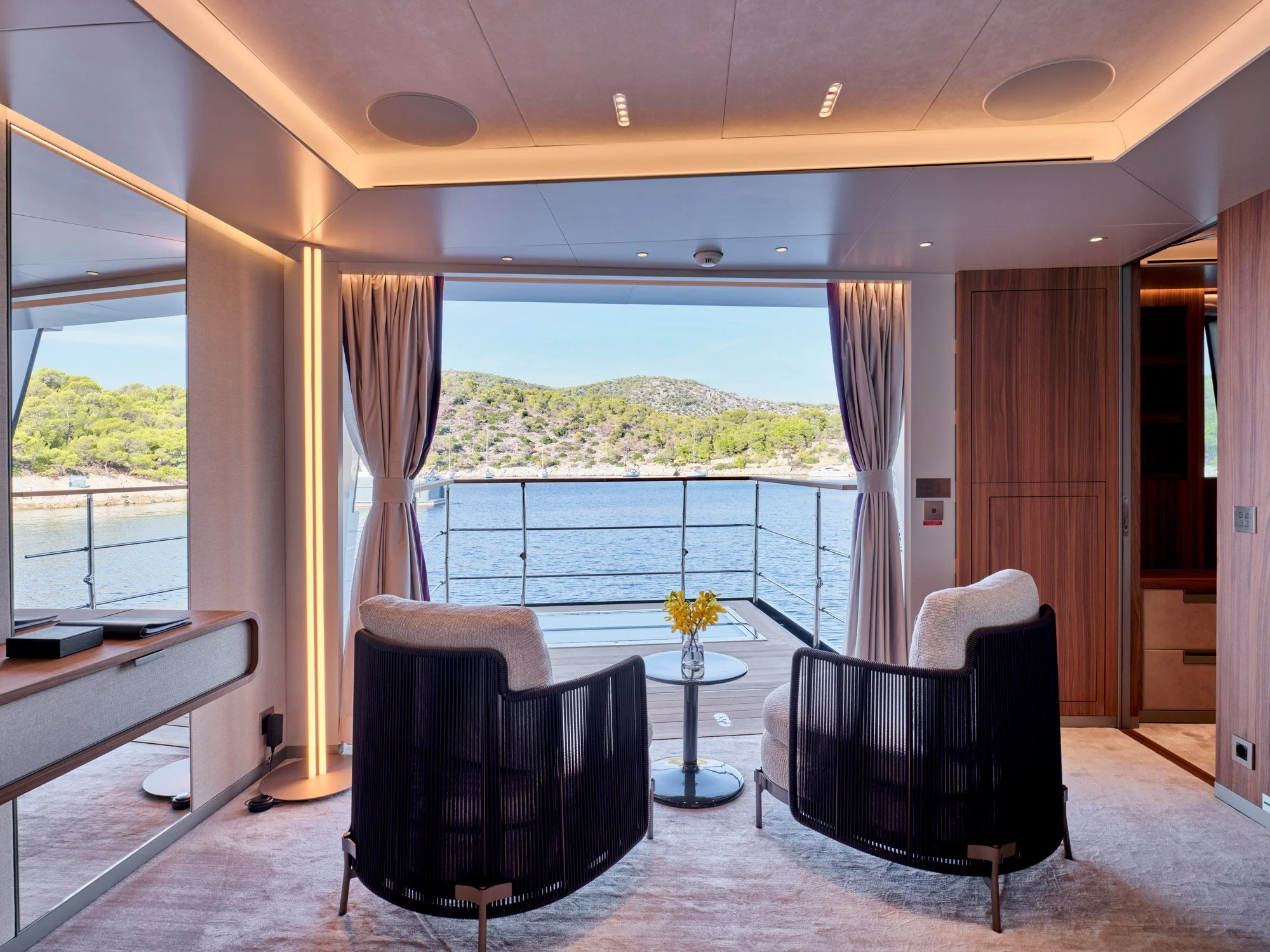 Main Deck Master Suite with a private fold-out balcony, office convertible to an extra stateroom, and full-beam ensuite.