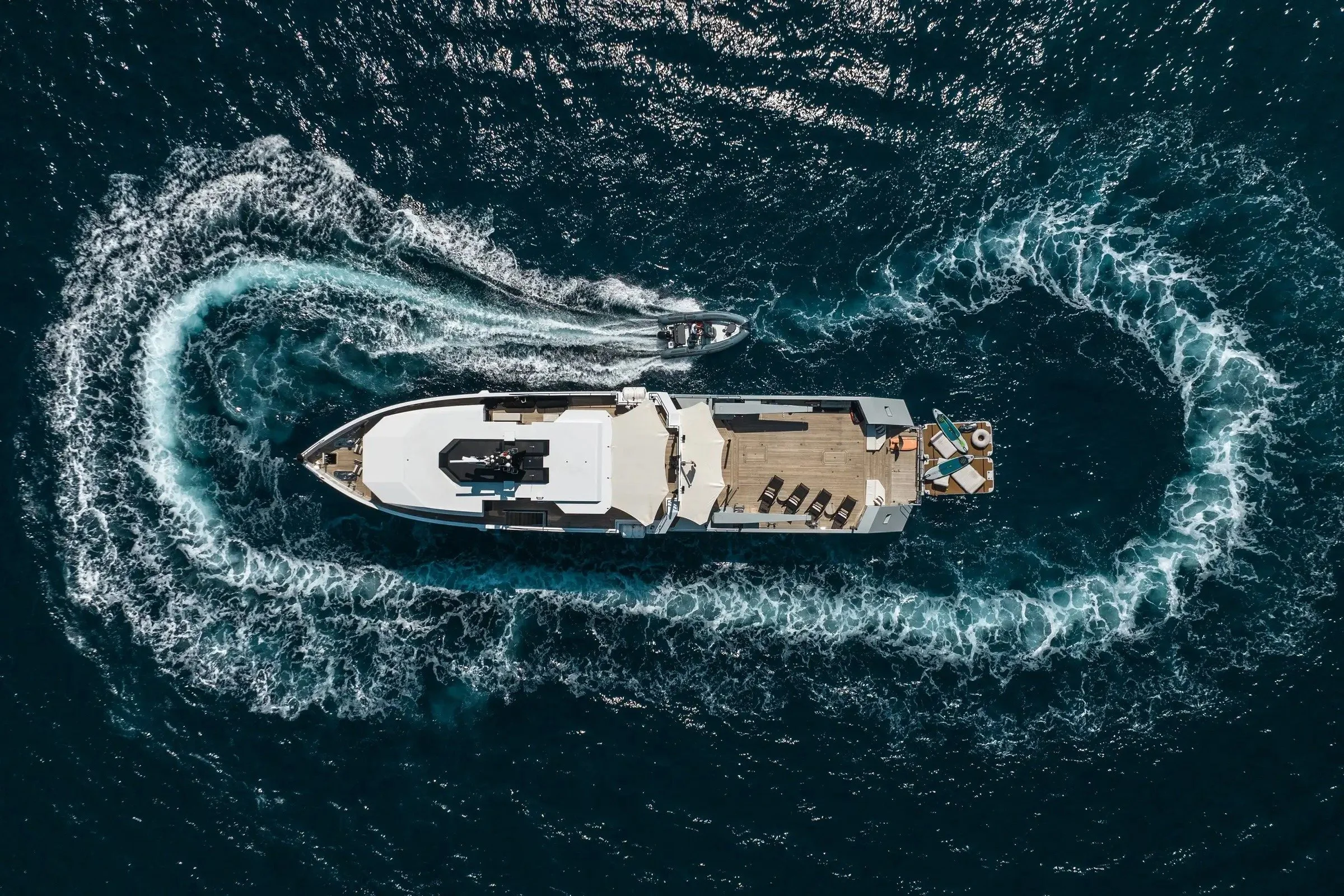 FOX’s exterior is muscular yet stylish, with vast open spaces tailored for versatility. Her 1,114 sq ft main deck aft is designed to carry an exceptional array of toys and tenders, including two 7.5m craft, amphibious vehicles, and submersibles, all launched via dual 2.5T SWL deck cranes. This level of carrying capacity is rarely seen in yachts under 40 meters.